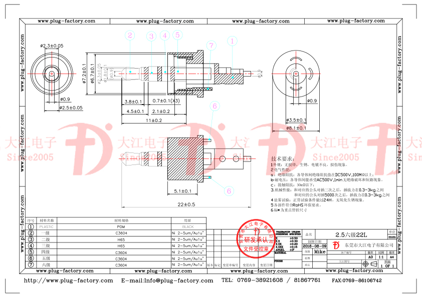 產品說明:2.5MM六級22L鍍金耳機插頭