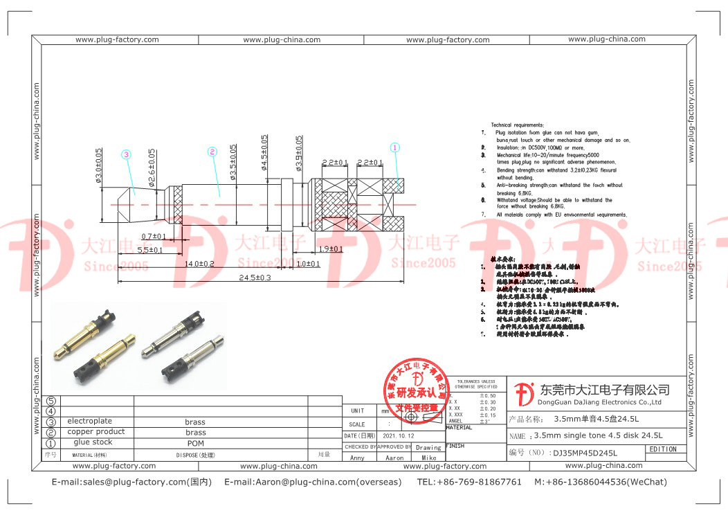 產品說明:耳機插頭-3.5單音4.5盤24.5L